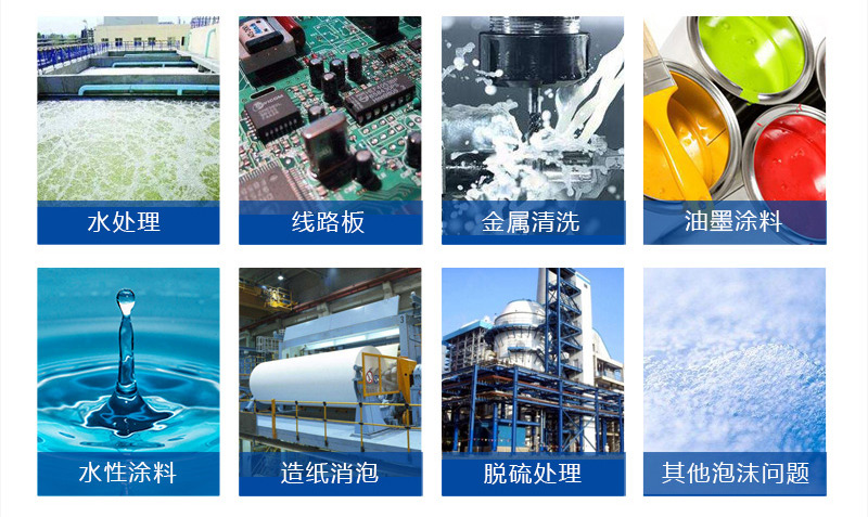 水性消泡劑廣泛應用于:水處理、工業(yè)清洗、金屬加工液、印染、造紙、涂料油墨、日化、農業(yè)、食品、脫硫、油田鉆井、采礦等水基體系和油性方面的消泡。